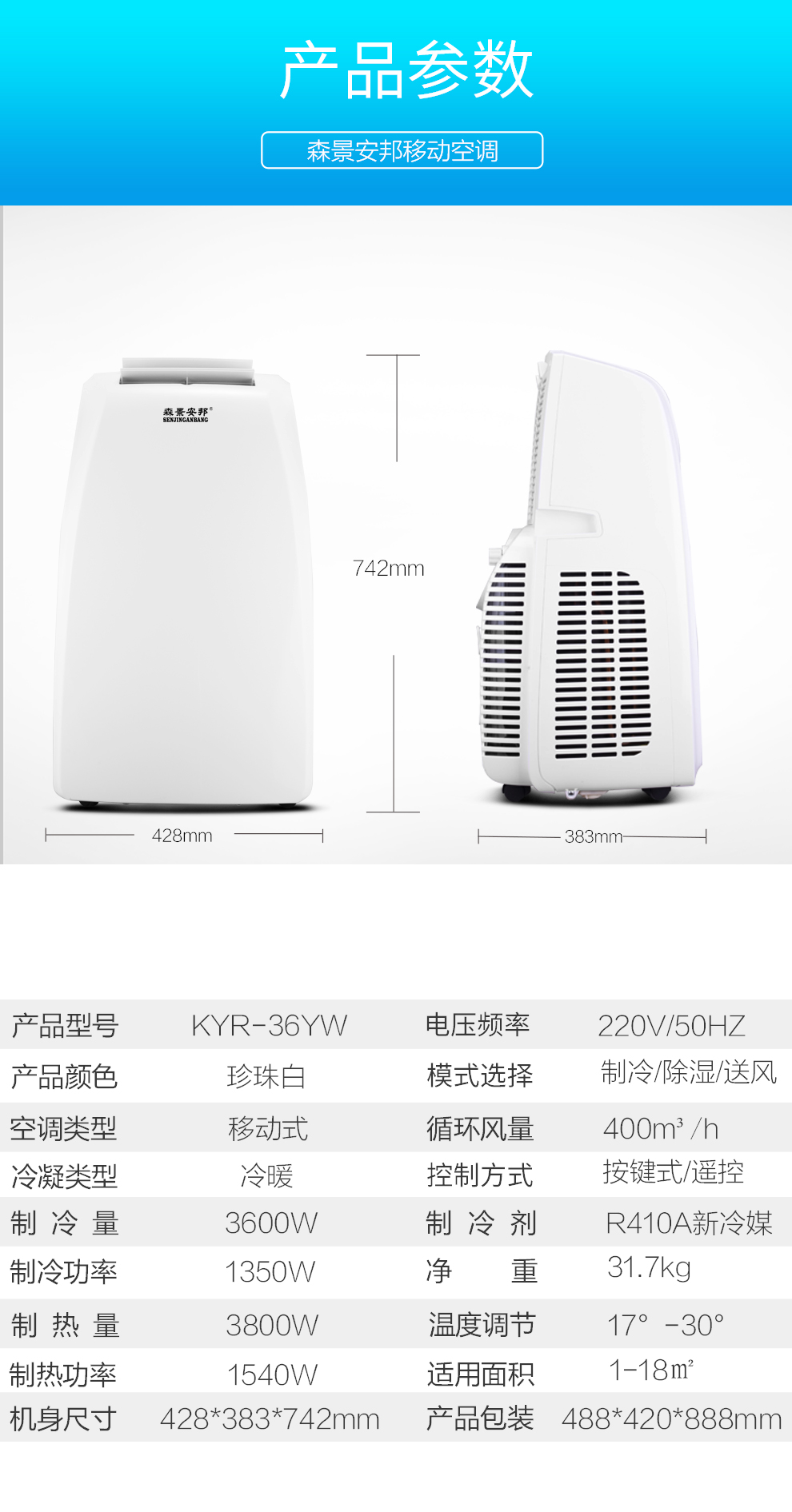 森景安邦移动空调1.5匹冷暖型可移动式空调免安装免排水厨房空调家用小户型空调